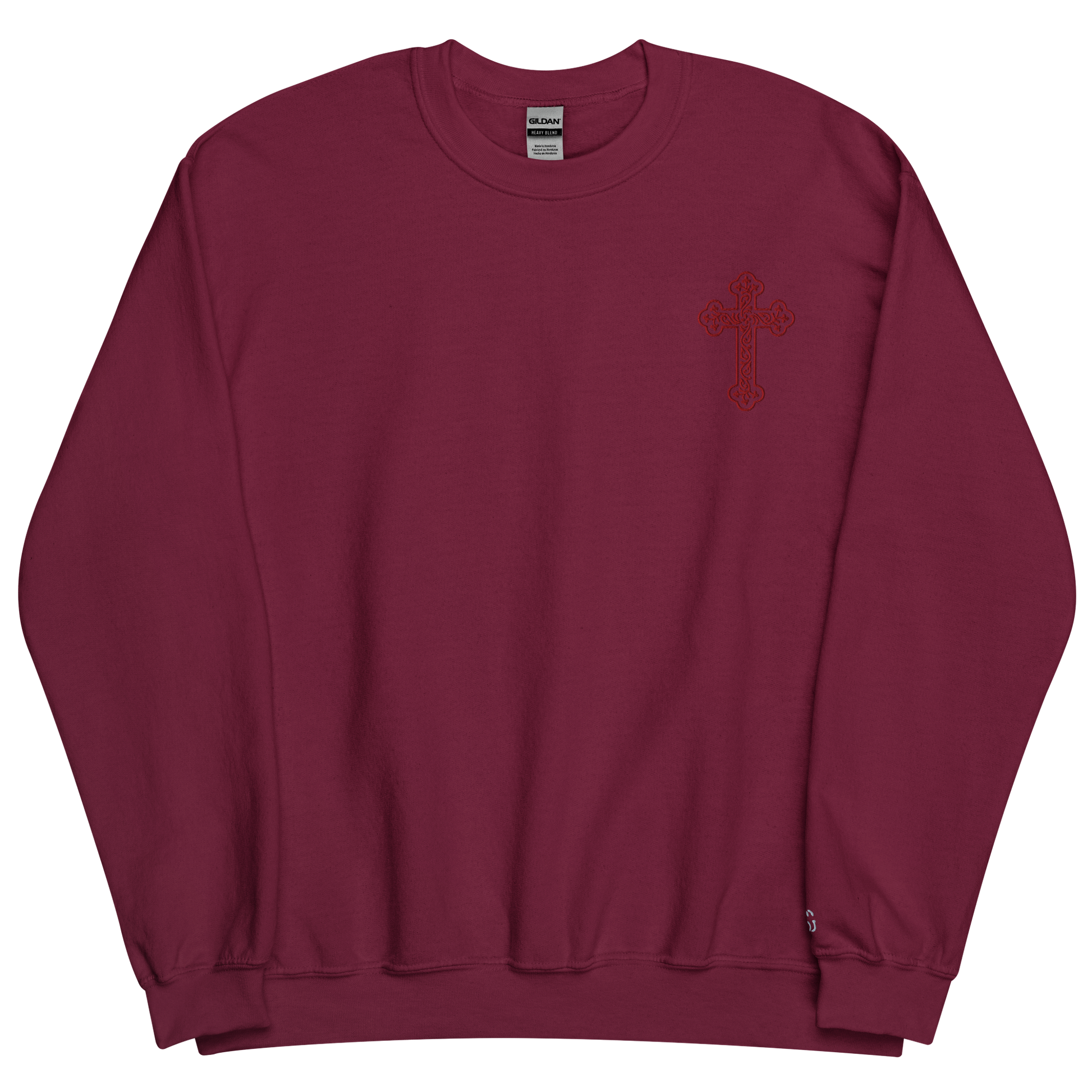 The left chest features an embroidered icon of an ornate Christian cross with clover arms and filigree details. Shepherds Guild monogram logo is embroidered on the left wrist.